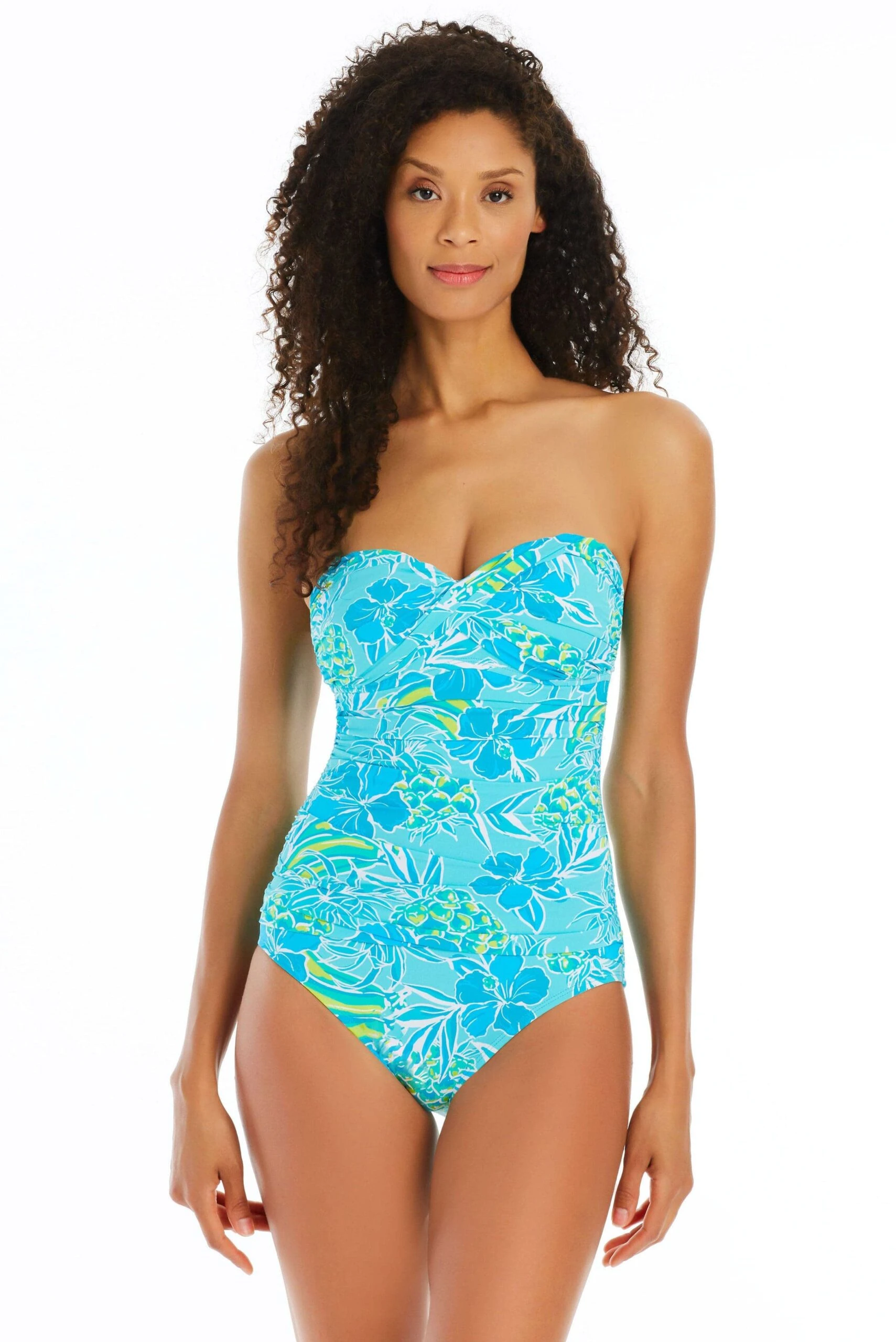 The strapless bandeau one-piece swimsuit from our Escape To The Beach collection is great for showcasing your shoulders and flattering the bustline. The neck strap can be added for extra support.