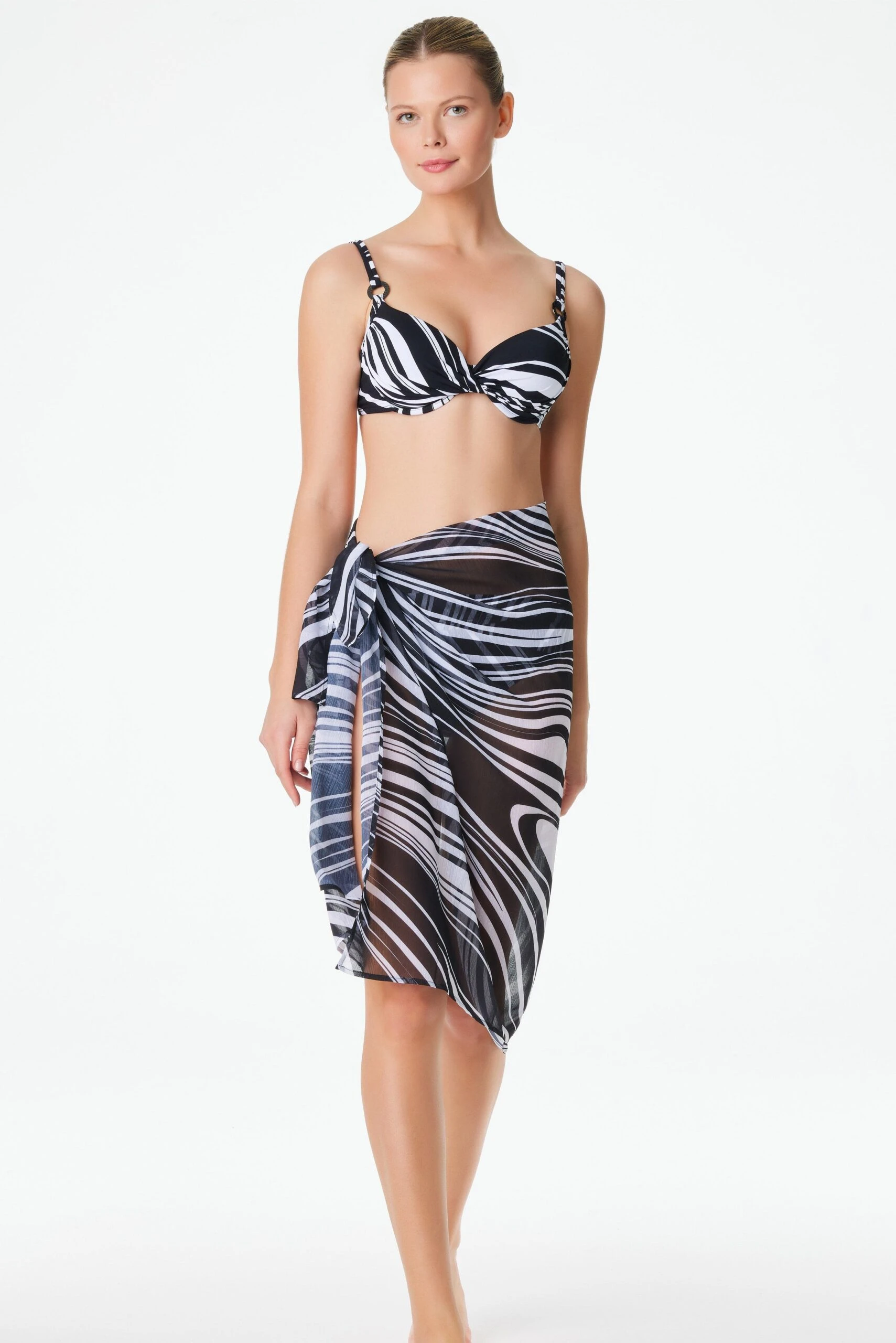 The side tie or tie front pareo cover-up from our New Wave collection is perfect for layering over bikini bottoms or even one-piece suits.
